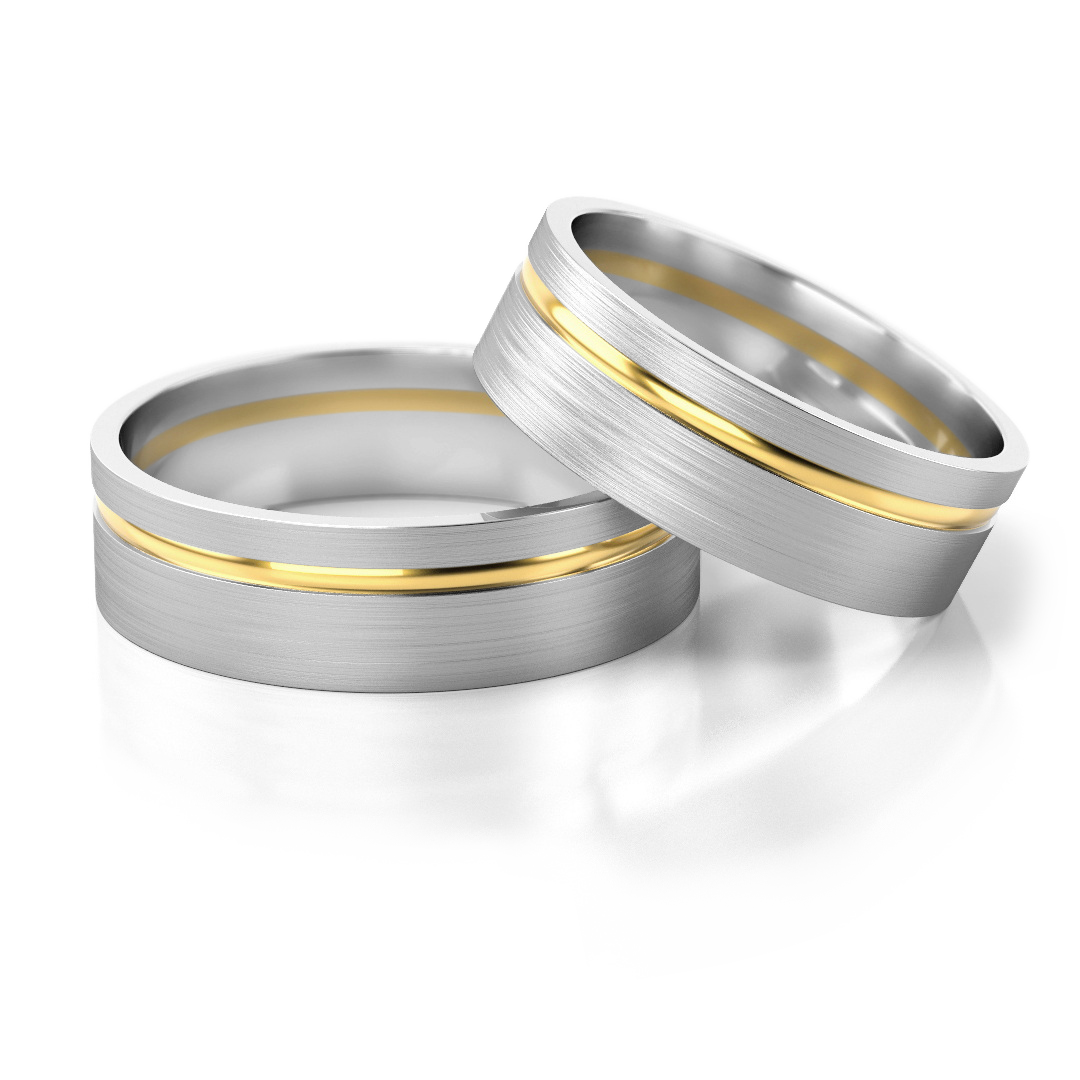Klassische Trauringe Nr. 139 mit eleganter Mittelbahn aus Gelbgold in Weißgold-Fassung. Das ausgewogene Bicolor-Design steht für Harmonie, Beständigkeit und stilvolle Zurückhaltung. Auf Wunsch auch in Gelbgold, Weißgold oder Roségold erhältlich.