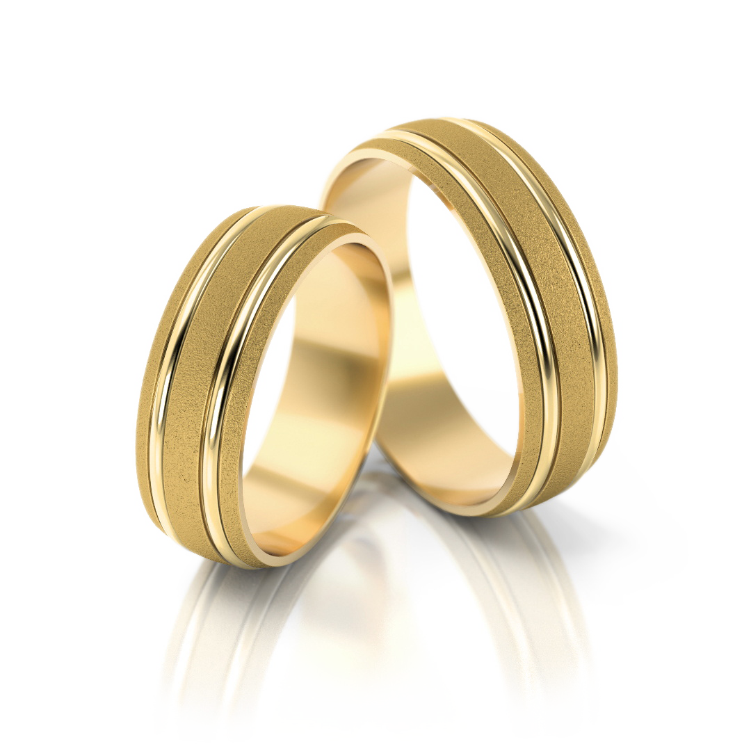 Diese Trauringe aus hochwertigem Gelbgold (333, 375, 585 oder 750) aus der Kollektion Industrial Eleganz verbinden zurückhaltendes Design mit moderner Ästhetik. Die mattierte Oberfläche wird durch polierte Linien dezent akzentuiert und verleiht den Ringen eine zeitgemäß-elegante Optik.