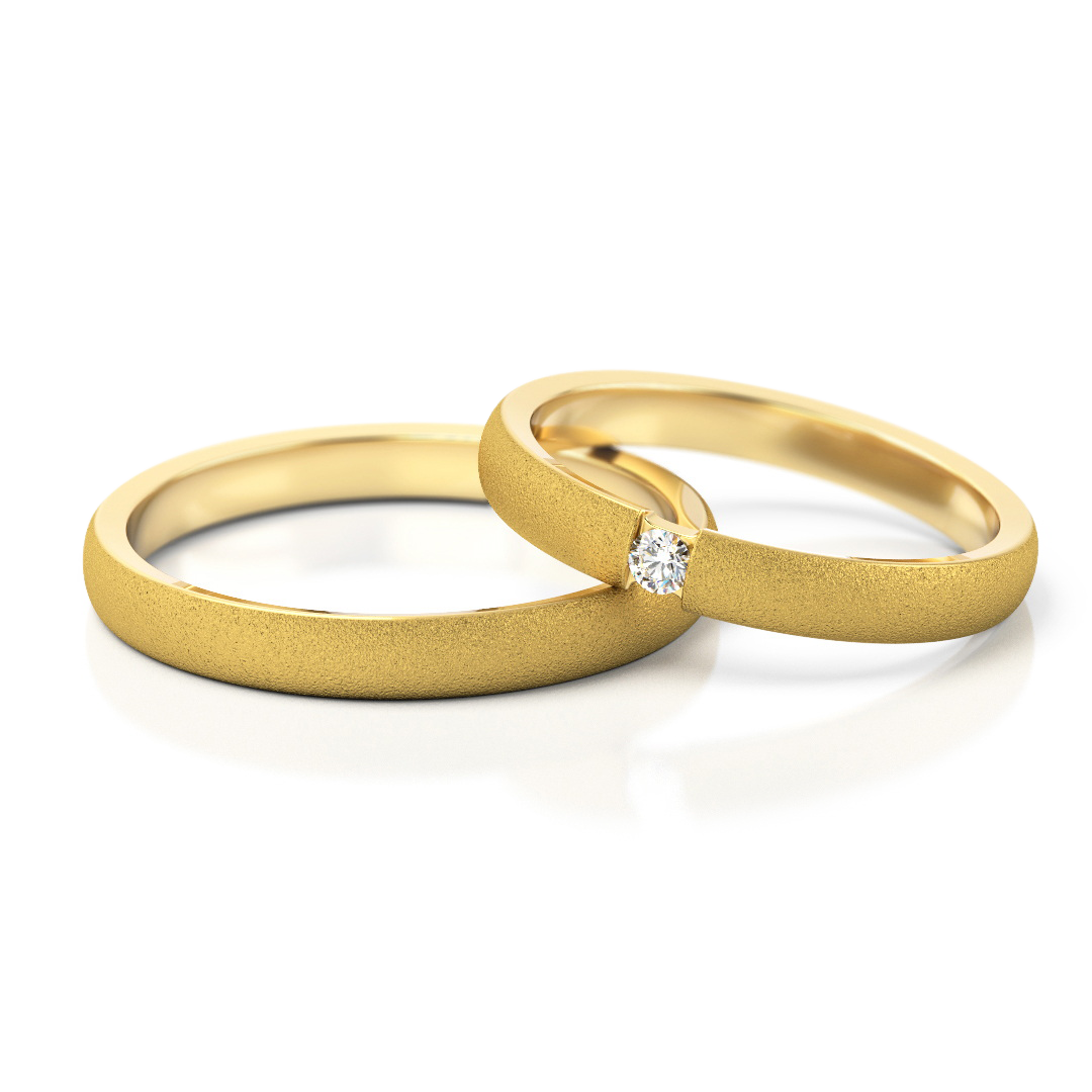 Elegante Eheringe in Gelbgold. Der Damenring ist mit einem 0.03 ct Stein wählbar: Diamant, Labordiamant . Zeitloses Design, 3 mm breit, perfekt für Paare, die schlichte und hochwertige Trauringe suchen.