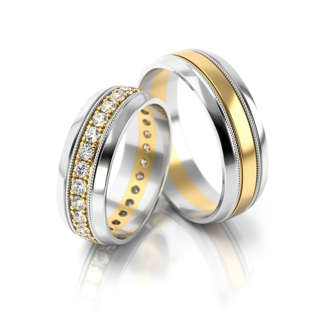 Extravagante Eheringe in Weißgelbgold. Modell 181 mit 6.5 mm Breite und 0.87 ct Steinbesatz im Damenring. Luxuriöse Bicolor-Trauringe für Paare mit exklusivem Stil.