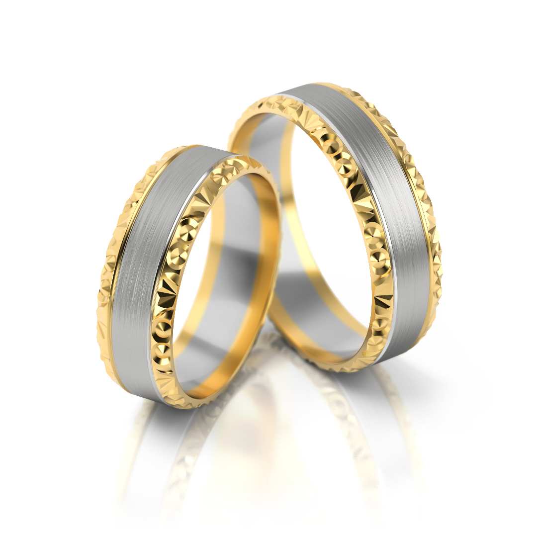 Die Trauringe Nr. 99 stehen für klassische Eleganz mit einem besonderen Akzent. Die harmonische Kombination aus warmem Gelbgold und kühlem Weißgold symbolisiert die Verbindung zweier Persönlichkeiten zu einer Einheit. Der mittlere, mattierte Weißgoldstreifen wird von fein verzierten Gelbgoldrändern eingerahmt und verleiht den Ringen Tiefe und Struktur. Dieses Design wirkt stilvoll, wertig und dennoch dezent – ideal für Paare, die einen klassischen Look mit individueller Note suchen. Dank der ausgewogenen Proportionen eignen sich diese Ringe hervorragend für den täglichen Gebrauch und behalten über viele Jahre ihre elegante Wirkung.