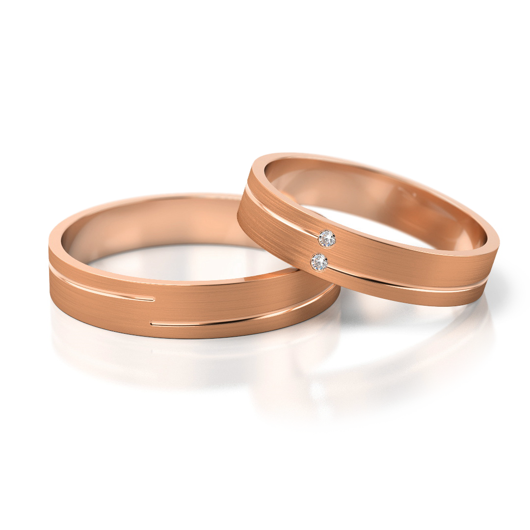 Eheringe in Gelb-, Weiß- oder Roségold aus der Linie Industrial Elegance. Modell 210 mit zwei Diamanten im Damenring – moderne Trauringe mit urbaner Eleganz.