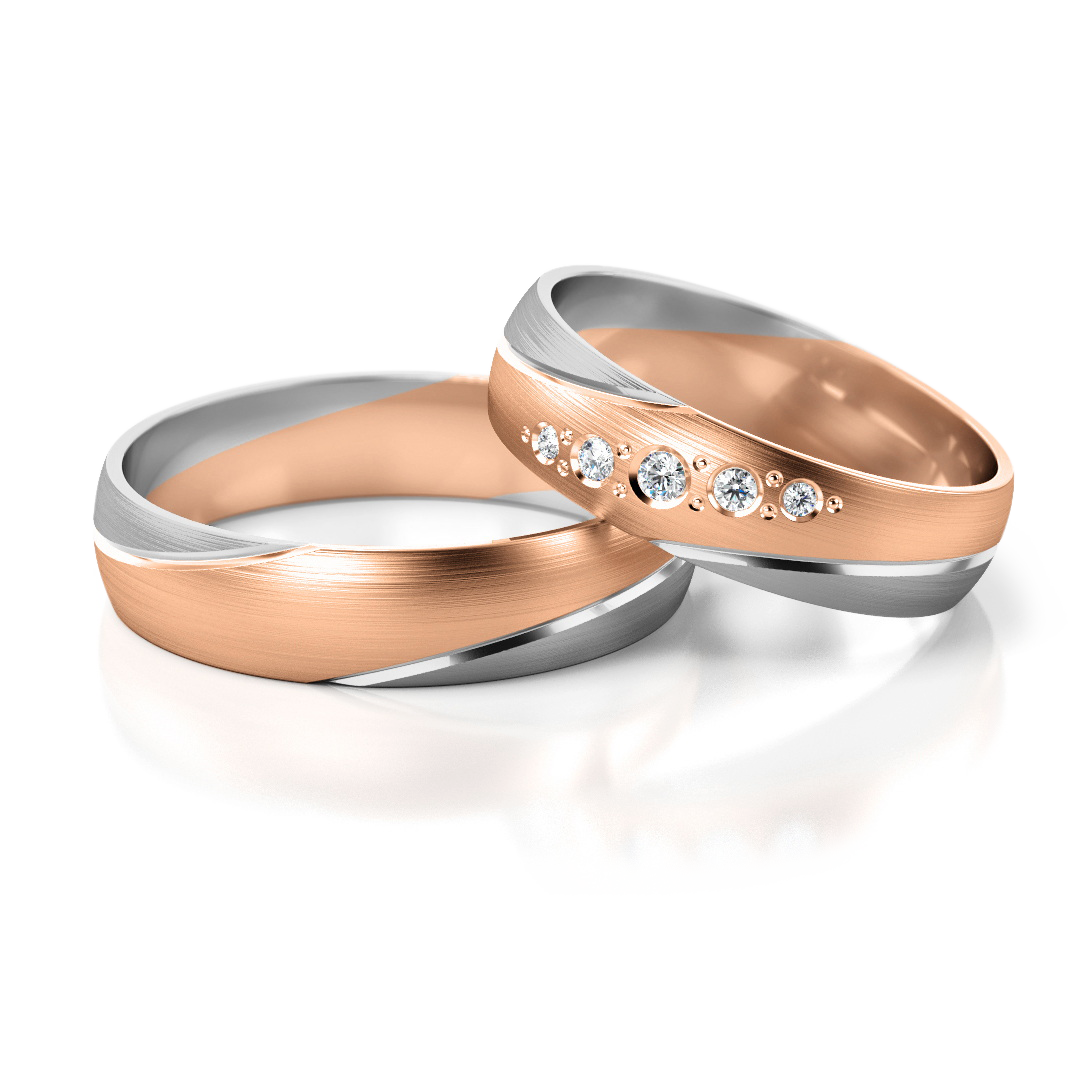 Trauringe Nr. 302 mit lockerer Interpretation des V-Motivs und dynamischen Schrägen. Die fließende Linienführung verleiht dem klassischen Design eine moderne Spannung, während der feine Steinbesatz im Damenring elegante Akzente setzt. Erhältlich in Gelbgold, Weißgold, Roségold sowie in verschiedenen Bicolor-Varianten. Breite: 5 mm, Höhe: 1,2 mm