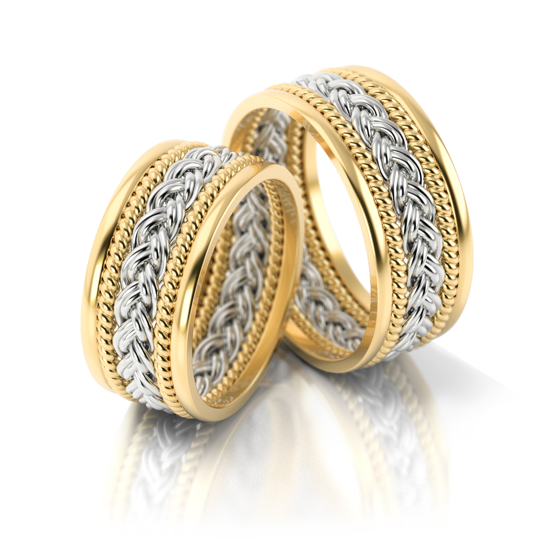 Jedes Paar wird in sorgfältiger Handarbeit gefertigt – ein echtes Unikat. Das Zusammenspiel aus kühlem Weißgold und warmem Gelbgold macht diese Ringe zu einem Symbol für Balance, Harmonie und dauerhafte Liebe.
