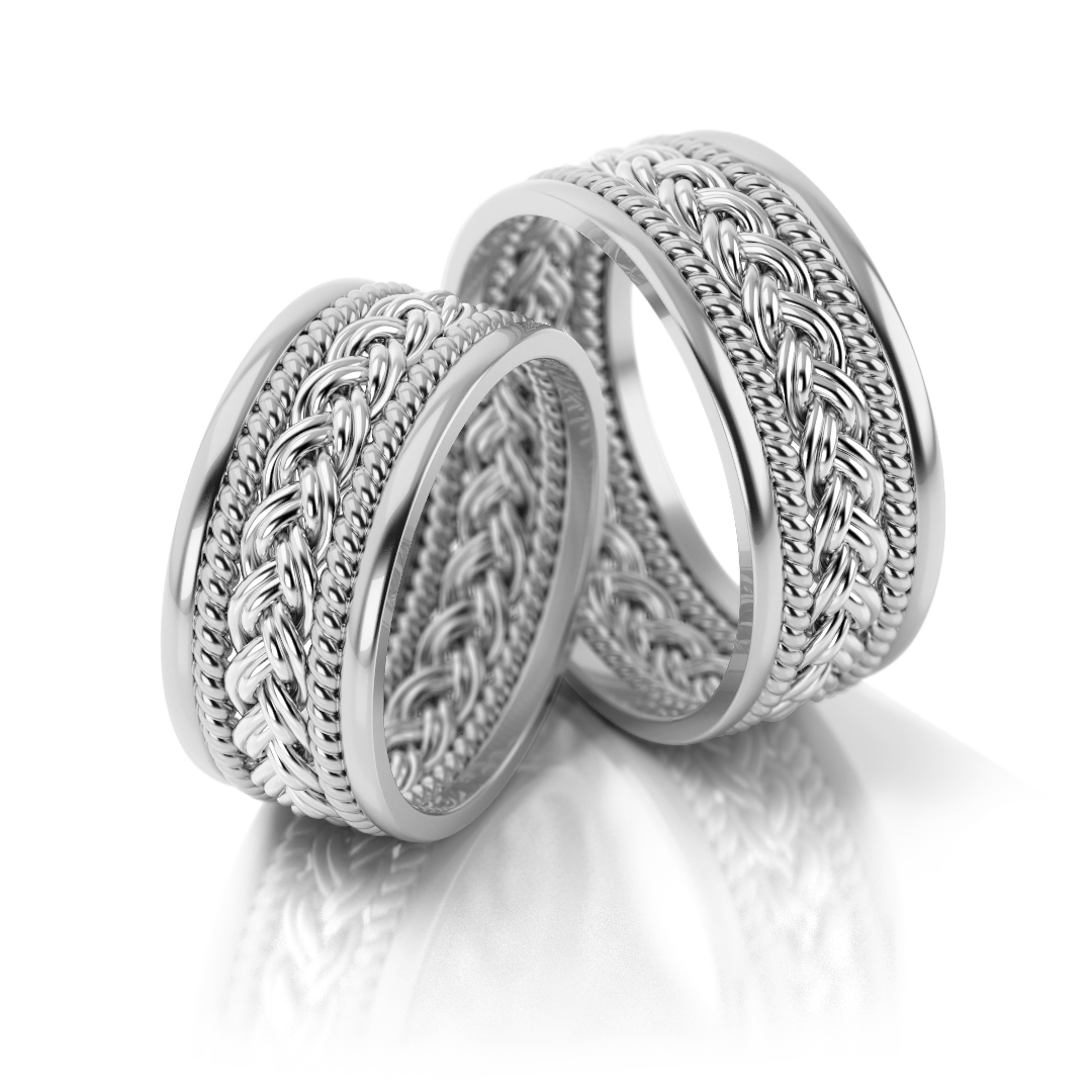 Im Mittelpunkt steht das aufwendig geflochtene Mittelband, das den Ringen Struktur und Tiefe verleiht. Feine Ornamente, sanfte Rundungen und glänzende Ränder unterstreichen den Vintage-Charakter, während das helle Weißgold einen Hauch von modernen Minimalismus einbringt.