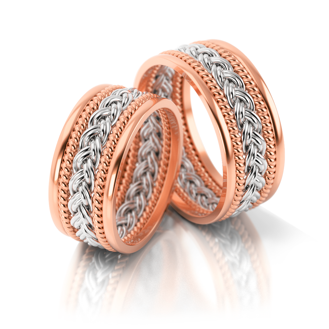 Das Herzstück dieser Ringe ist das fein geflochtene Mittelband, Symbol für die Verbundenheit zweier Menschen. Es erinnert an handgearbeitete Schmuckstücke vergangener Zeiten – kunstvoll, charakterstark und voller Symbolik. Die polierten Ränder bringen das Flechtmuster zum Leuchten, während die Kombination aus Weiß- und Roségold den Ringen Tiefe, Bewegung und Lebendigkeit verleiht.