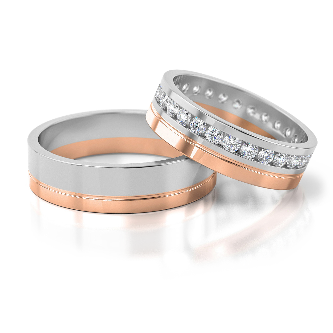 Elegante Trauringe Nr. 78 aus der Kollektion Extravagant. Damenring mit mittig gefassten Steinen (Diamanten, Zirkonia oder Lab-Diamanten), Herrenring mit feiner Linie und polierter Oberfläche.