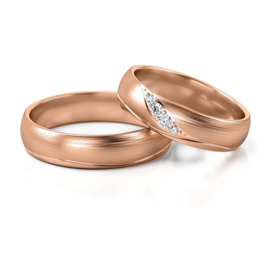 Elegante Trauringe Nr. 283 in Roségold mit sanftem Linienmotiv und funkelndem Steinbesatz im Damenring. Die geschwungene Form symbolisiert Verbindung, Harmonie und gemeinsame Bewegung. Erhältlich in Gelbgold, Weißgold, Roségold sowie in der edlen Bicolor-Variante.