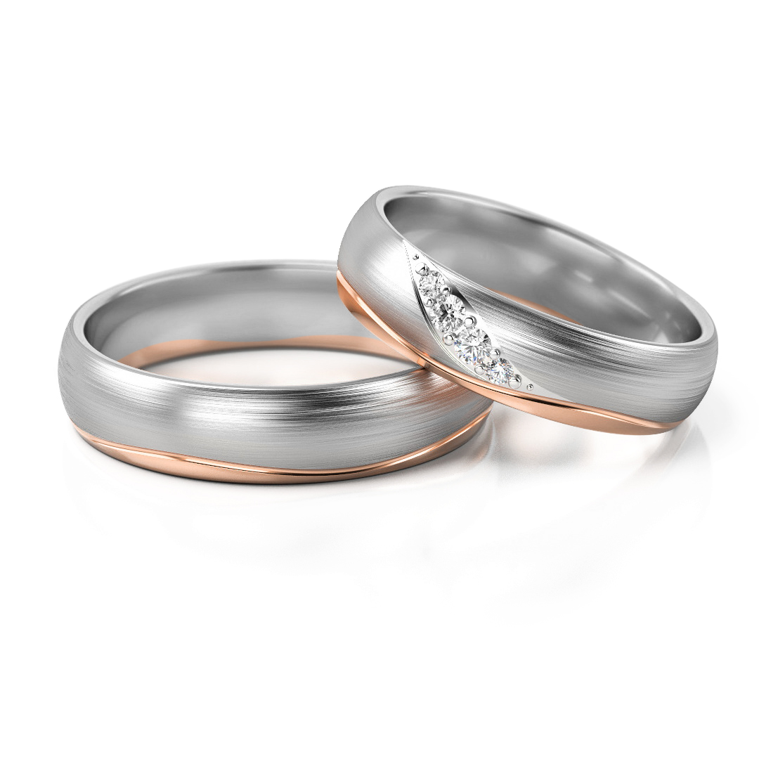 Der Damenring ist mit fein gefassten Steinen versehen, wahlweise Diamanten oder Labordiamanten, die entlang der geschwungenen Linie funkeln. Dieses dezente Strahlen unterstreicht die elegante Bewegung des Designs und verleiht dem Ring eine romantische, hochwertige Ausstrahlung. Der Herrenring greift das Linienmotiv in einer klaren, ruhigen Form auf und ergänzt das Paar mit zeitloser Eleganz.