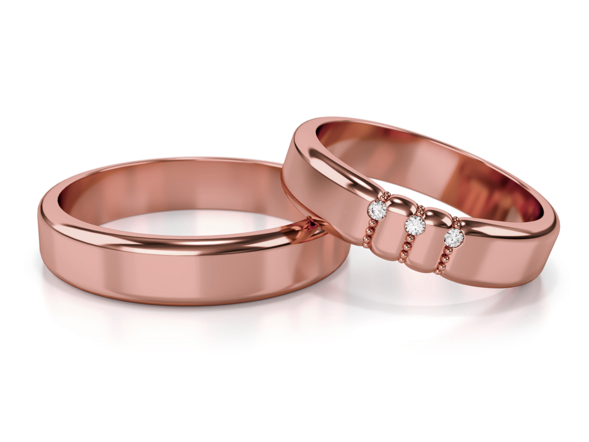Moderne Eheringe aus Gelbgold, Weißgold oder Rotgold. Modell 332 mit 4.5 mm Breite und 0.045 ct Steinbesatz im Damenring. Elegante Trauringe aus der Linie Neuheiten.