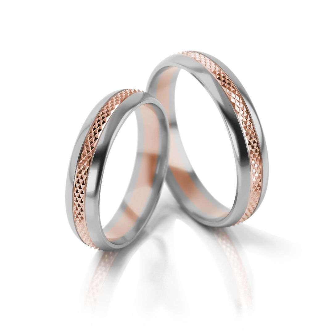 Diese exklusiven Trauringe kombinieren edles Weißgold mit warmem Roségold und schaffen so ein faszinierendes Spiel aus Farbe und Kontrast. Mattierte Flächen wechseln sich harmonisch mit glänzend polierten Linien ab und verleihen den Ringen einen modernen, zugleich zeitlosen Charakter.