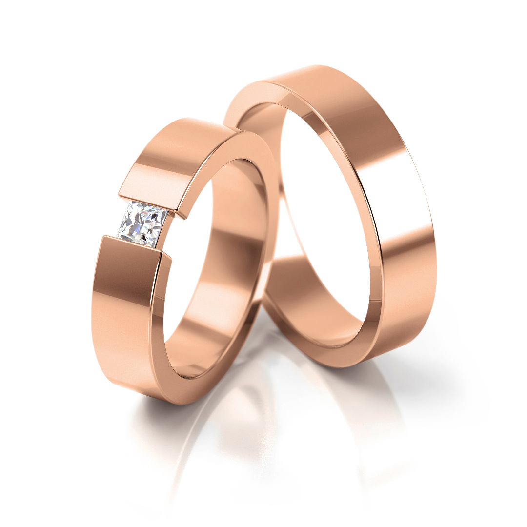 Elegante Eheringe im Stil Pure Eleganz, erhältlich in Weißgold, Gelbgold oder Roségold (333–750). Der Damenring ist mit einem frei schwebenden Stein im Spann-Design verziert – wahlweise Diamant, Labordiamant . Zeitlos, modern und äußerst komfortabel zu tragen. Technische Details: Modellnummer: 164 Breite: 5 mm Höhe: 2,3 mm Gesamtkarat (Stein): 0,16 ct