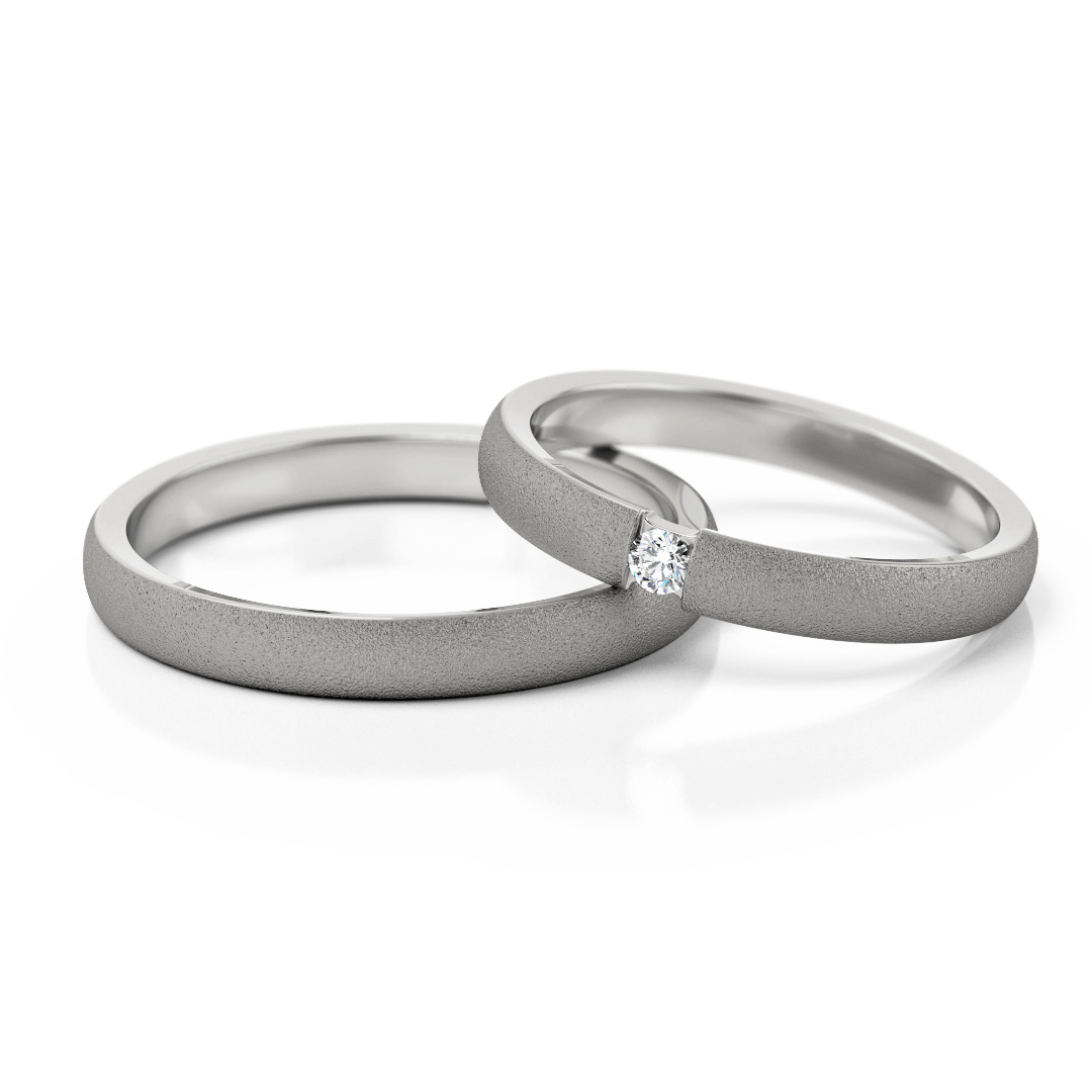 Elegante Eheringe in Weißgold. Der Damenring ist mit einem 0.03 ct Stein wählbar: Diamant, Labordiamant . Zeitloses Design, 3 mm breit, perfekt für Paare, die schlichte und hochwertige Trauringe suchen.