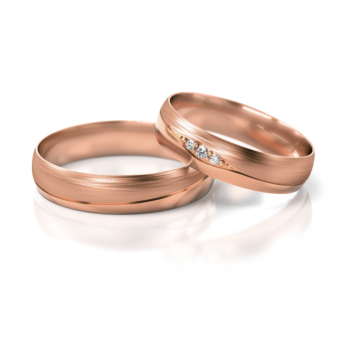 Trauringe Nr. 275 mit fließendem V-Motiv, das Wellenbewegung, Verbindung und Symbiose symbolisiert. Die harmonische Linienführung und der dezente Steinbesatz im Damenring verleihen dem klassischen Design eine moderne, bedeutungsvolle Tiefe. Erhältlich in Gelbgold, Weißgold, Roségold sowie in verschiedenen Bicolor-Varianten. Breite: 4,5 mm, Höhe: 1,3 mm, Gesamtgewicht der Steine: ca. 0,035 ct