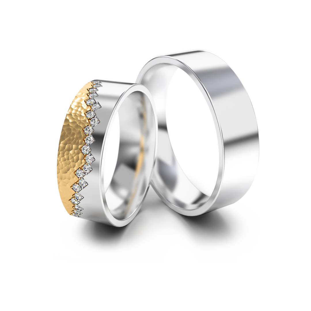 Moderne Eheringe in neun Varianten aus Gelbgold, Weißgold, Roségold und Bicolor. Damenring mit gehämmerter Oberfläche und 0.21 ct Steinbesatz, Herrenring glatt poliert. Breite 6 mm – hochwertige, elegante Trauringe für moderne Paare.