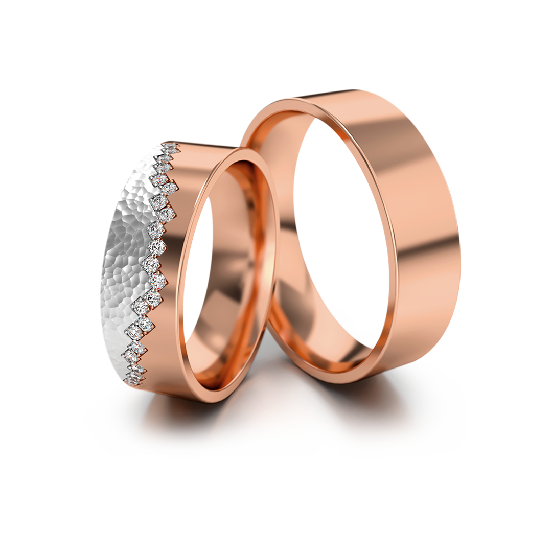 Moderne Eheringe in neun Varianten aus Gelbgold, Weißgold, Roségold und Bicolor. Damenring mit gehämmerter Oberfläche und 0.21 ct Steinbesatz, Herrenring glatt poliert. Breite 6 mm – hochwertige, elegante Trauringe für moderne Paare.