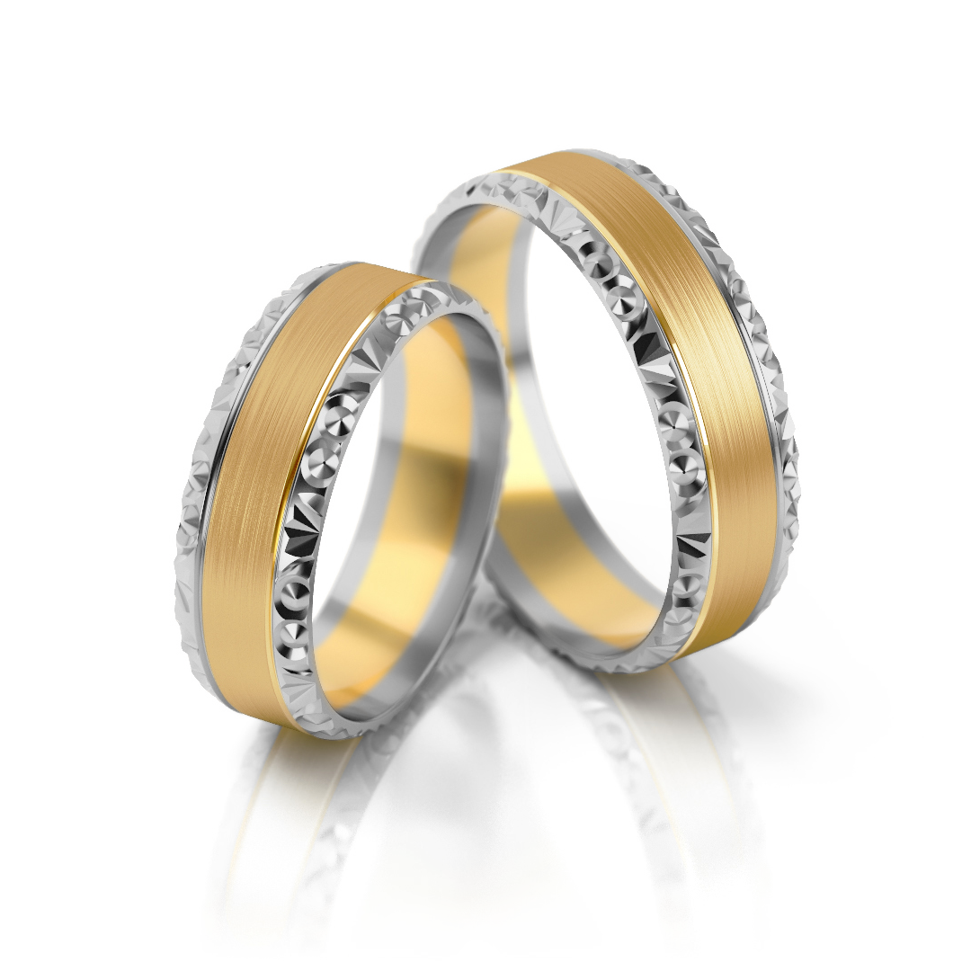 Trauringe Nr. 99 verbinden klassisches Design mit einer edlen Bicolor-Optik aus Gelb- und Weißgold. Die fein strukturierte Oberfläche und der elegante Mittelstreifen verleihen den Ringen eine zeitlose, hochwertige Ausstrahlung – perfekt für Paare, die Tradition und Stil schätzen.
