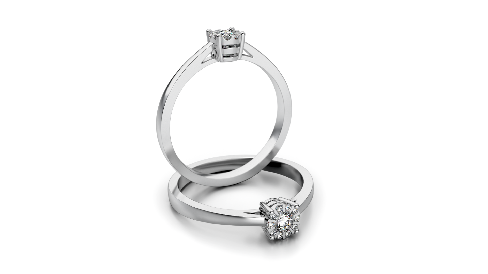 Der Verlobungsring ST14 aus Weißgold überzeugt durch seine elegante Erscheinung und eine klassische Diamantfassung. Im Mittelpunkt steht ein funkelnder Diamant, der von weiteren Diamanten umrahmt wird und dem Ring eine besonders strahlende Wirkung verleiht. Diese ausgewogene Komposition sorgt für eine edle, luxuriöse Ausstrahlung, ohne aufdringlich zu wirken.