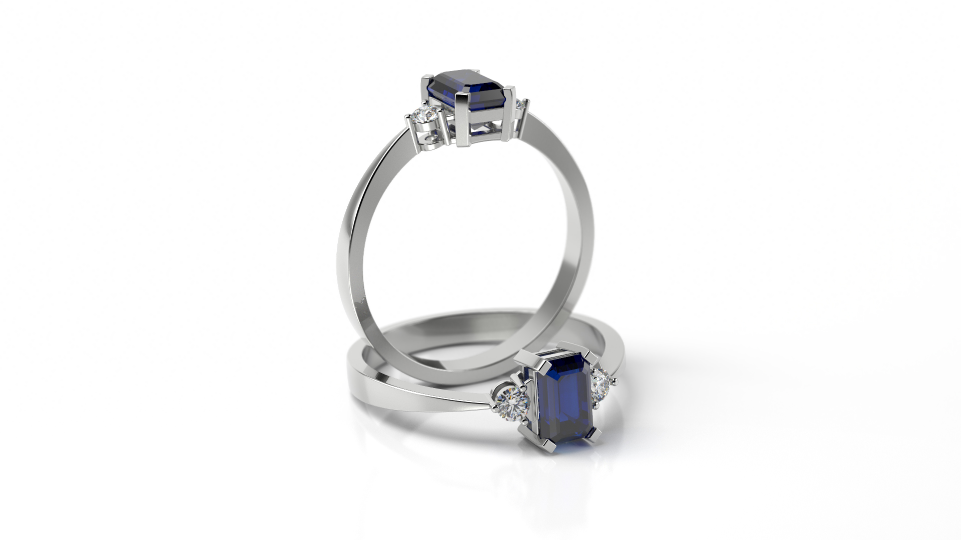 Der Verlobungsring ST20 aus Weißgold überzeugt durch seine moderne Eleganz und eine markante Edelsteinfassung. Im Zentrum steht ein rechteckiger Saphir in der Größe 6×4 mm, dessen klare Form und tiefe Farbwirkung dem Ring eine besondere Ausdrucksstärke verleihen. Seitlich gefasste Diamanten ergänzen den Zentralstein harmonisch und sorgen für ein ausgewogenes, edles Funkeln.