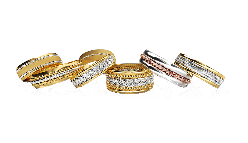 Trauringe Nr. 134 im Vintage-Boho-Stil – zweifarbige Ringe aus Gelbgold und Weißgold mit Herz-Flechtmuster und gedrehten Goldbändern. Breite: 7 mm, Höhe: 1.4 mm